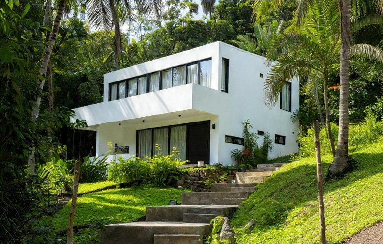 Façade lumineuse : Le revêtement blanc éclatant contraste avec les cadres de fenêtres noirs, reflétant le style tropical moderne et aidant à repousser la chaleur.
